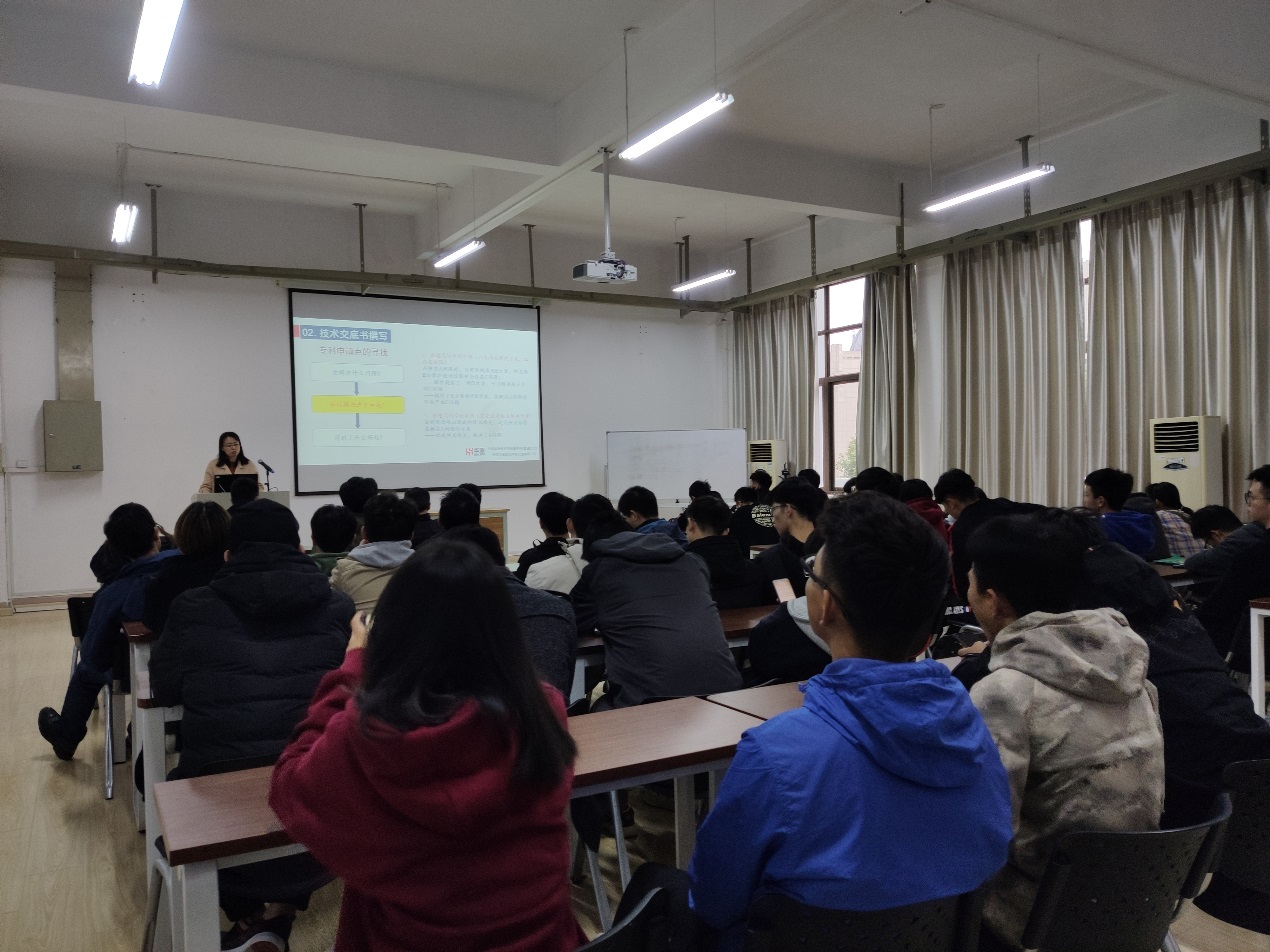 无锡华源专利商标事务所周洁老师(原专利局审查协作中心审查员)介绍了公司的相关资质情况,并从审查员的角度就专利申报流程、挖掘专利创新点的方式方法、准备专利申请文件的注意事项等方面为师生做了详细介绍,并回答了师生在申报专利过程中遇到的问题。